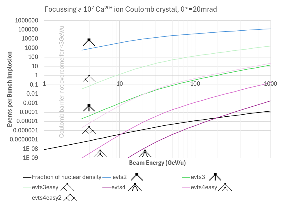 2026-Mar-03 22:05:43 I noticed before that you can approach the nuclear density by taking an ultra-cold Coulomb crystal, putting it through a TeV-scale particle accelerator and then focussing it to an extremely small spot. But does anything interesting happen with a slightly smaller accelerator? It turns out that pair-wise nuclear interactions within the imploding beam are joined by 3-way and 4-way ones as energy and density increase. Depending on how stable the intermediate products are, you can also get chained collisions within the bunch diameter. #physics #accelerators