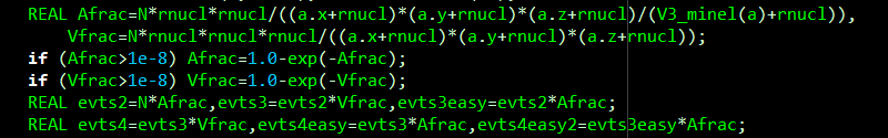 2026-Mar-06 16:54:42 To approximate the expected number of multi-way collisions, I used a simple physical model where nuclei are spheres with density 2.5e17 kg/m^3 and they interact if the centre of one goes within another. Then in the code below I work out a "volume fraction" of the focal ellipsoid that is filled and an "area fraction" that is filled in 2D projection seen from the side with largest area. 2-way collisions are expected to occur N*Afrac times and this matches the traditional luminosity formula if you expand it out. True 3-way collisions require an additional factor of Vfrac to get the 3rd nucleus exactly where you want it at that instant, whereas chained 3-way collisons (two consecutive collisions within the focal point) require only a factor of Afrac, which is larger. This gave the graphs in my previous post. The numbers behave similarly with a small shift for different nuclei although I used calcium as a mid-Z choice. Things like the D-T resonance are not included!